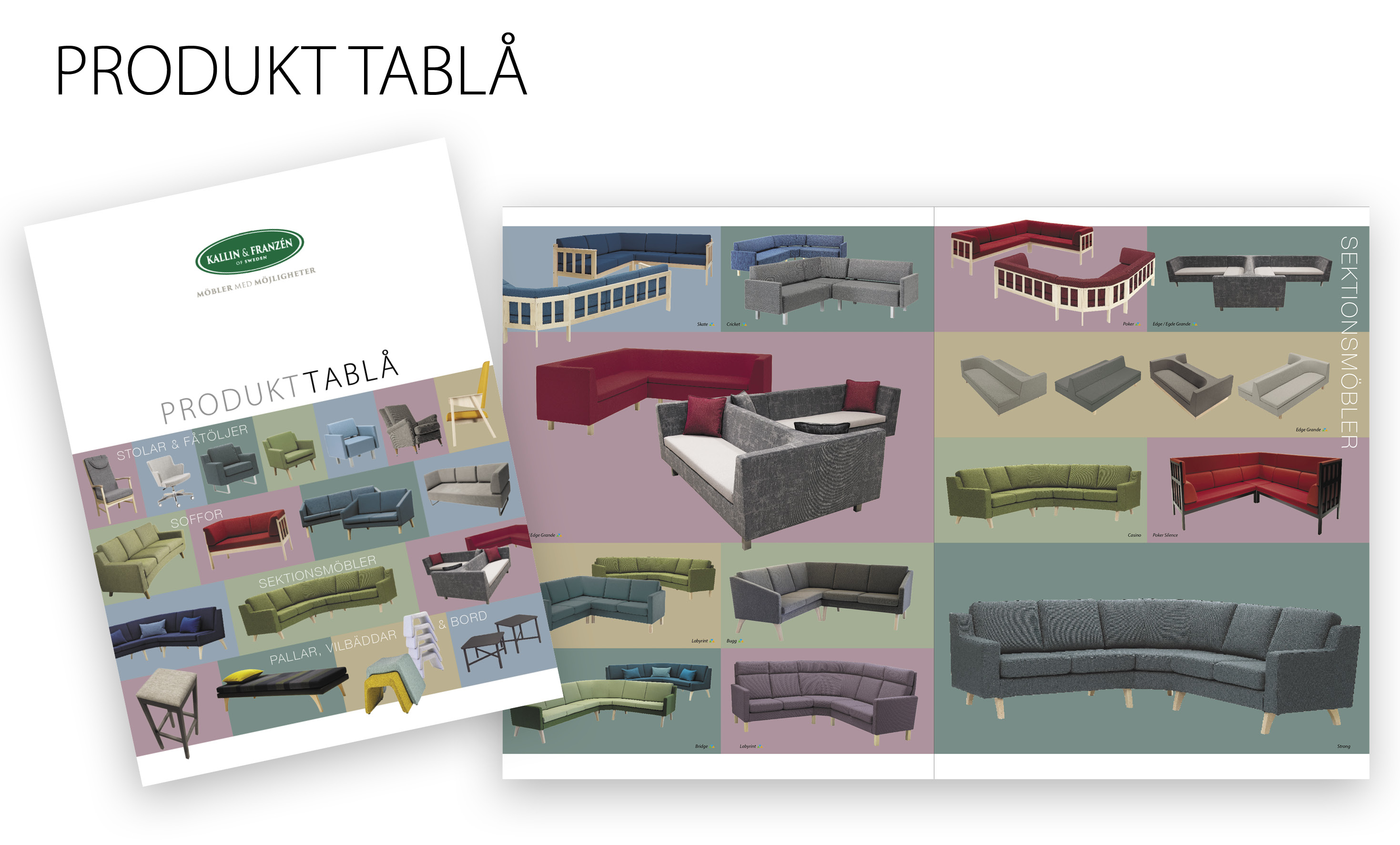 Men nu har vi även tagit fram en ny och fräsch PRODUKTTABLÅ. Den är istället organiserad efter funktion – stol/fåtölj, soffa, sektionsmöbel eller bord och pall. På några få uppslag får du därför en fin totalöversikt över hela vårt sortiment. Här kan du alltså välja produkt efter vilken form och uttryck du eftersträvar för ett visst behov. På första uppslaget kan du ändå lätt finna vilka propduktfamiljer som finns.